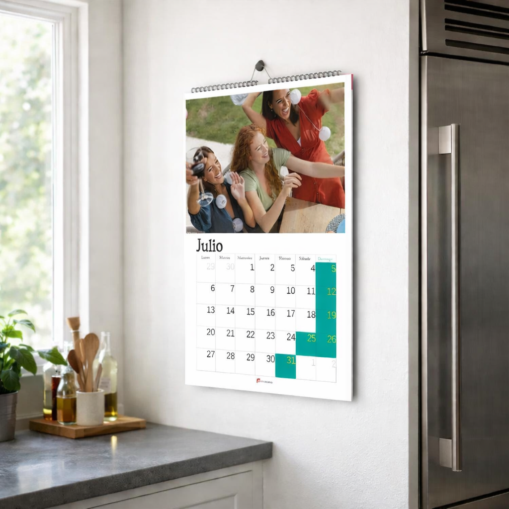 Incluye 14 páginas: una portada personalizable y 13 meses configurables, para que puedas comenzar cuando tú quieras. En cada mes puedes añadir tus propias fotografías y notas, creando un calendario práctico y lleno de recuerdos.